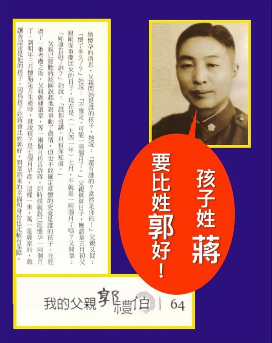 此時的郭禮伯,已調去重慶,不過與章亞若的交往持續著。黃澎孝說,「有一段時間是蔣經國跟郭禮伯的重疊期;所以,到底這兩個孩子是誰的,當時沒有辦法驗DNA,相信蔣經國心裡也是有懷疑」。