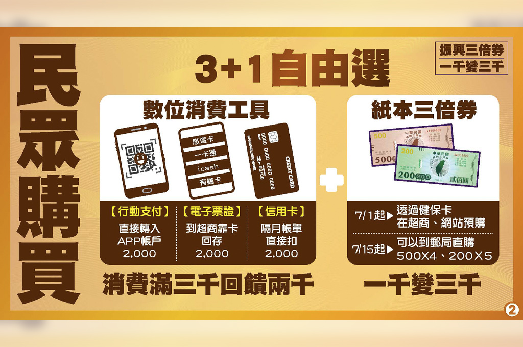 另外,選擇行動支付、電子票證與信用卡的民眾,可於7月1日至12月31日期間,先上網登錄綁定數位工具,7月15日起至年底,至實體店家使用累計滿3,000元,可透過行動支付APP帳戶、電子票證至超商靠卡、信用卡抵扣帳單的方式,領回2,000元,等於自己只要負擔1,000元,政府幫你出2,000元,一樣可享受到3,000的消費。