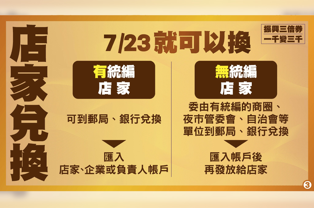 收到三倍券1個禮拜後,有統編的店家即可至郵局、銀行兌換,會直接匯入負責人的帳戶;沒有統編的店家,則能委託有統編的商圈、夜市管委會、自治會等單位到郵局與銀行兌換。