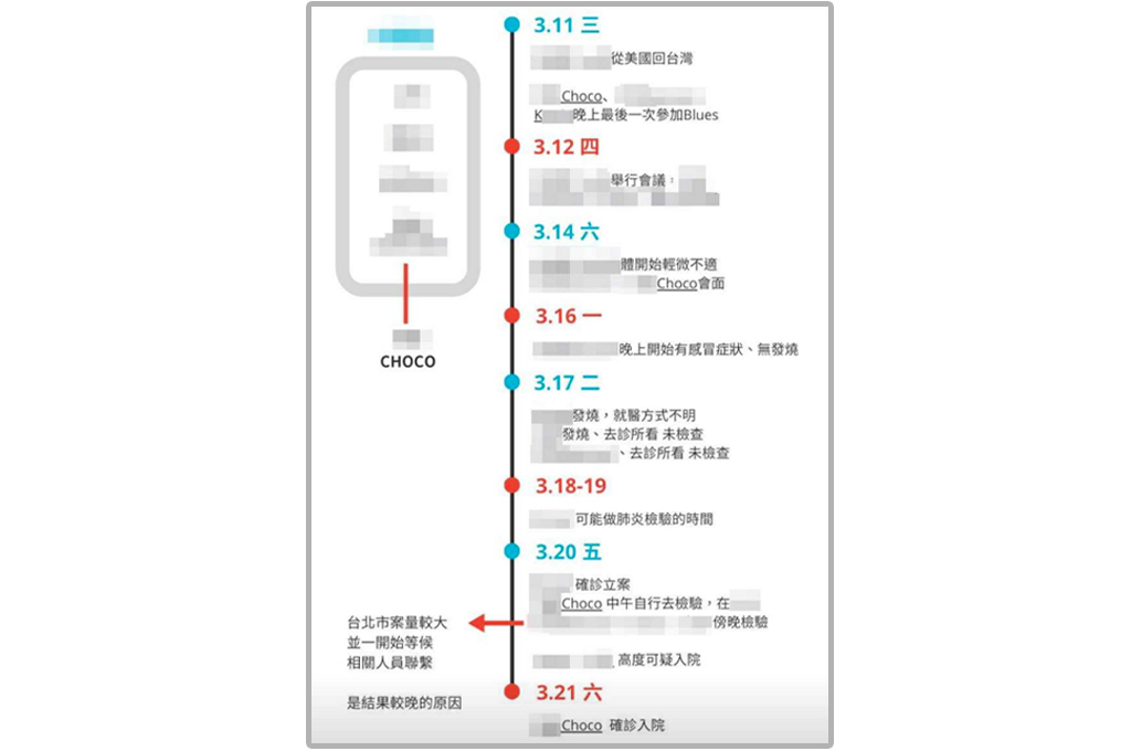 她還原住院第一天,早上6點多醒來,決定做整個群聚感染的時間軸。她笑稱,因為要跟太多人解釋,不如做時間軸比較好了解。