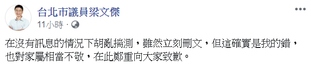 梁文傑:「在沒有訊息的情況下胡亂揣測,雖然立刻刪文,但這確實是我的錯,也對家屬相當不敬,在此鄭重向大家致歉。」