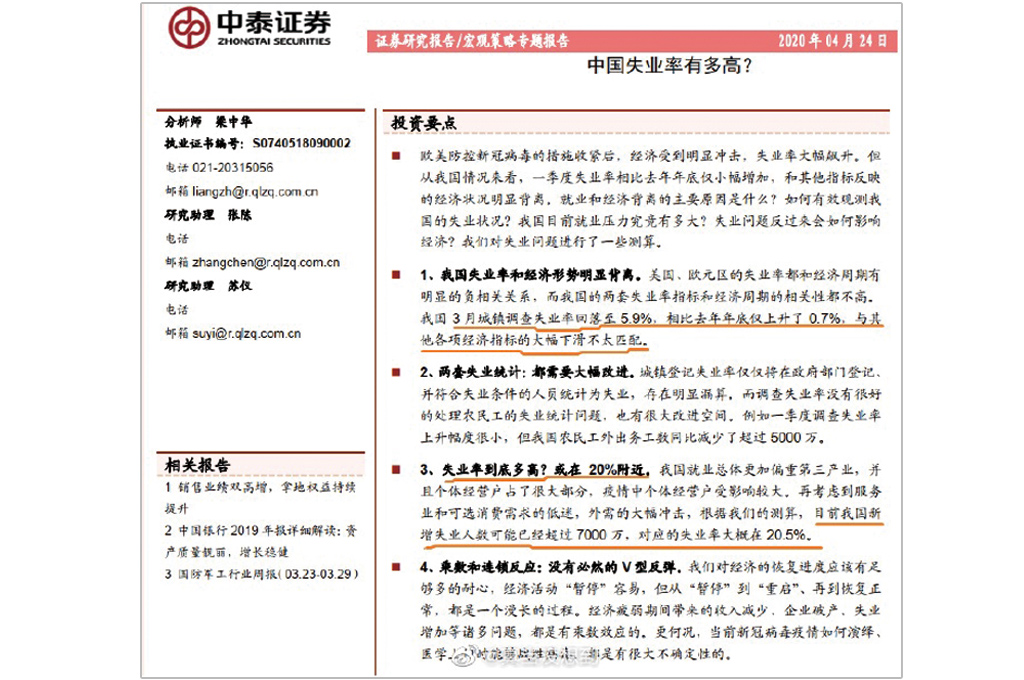 讓我們無視中國官方宣稱那精美的失業率,看看中泰證券研究所所長李迅雷的分析內容,他發表了一篇「中國的失業率數字有多高?」的報告,內容中,中國的失業數應高超過7000萬,換算成失業率約20.5%。