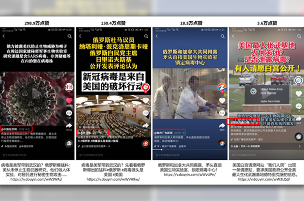 觀看今年疫情肆虐之際,網路上開始熱烈討論「病毒從哪裡來?」,當輿論風向都將矛頭指向中國時,外交部趙立堅3月故意拋出「美軍帶毒到武漢」的推文,中國官媒的抖音帳號更利用短視頻重複上述陰謀論的觀點。