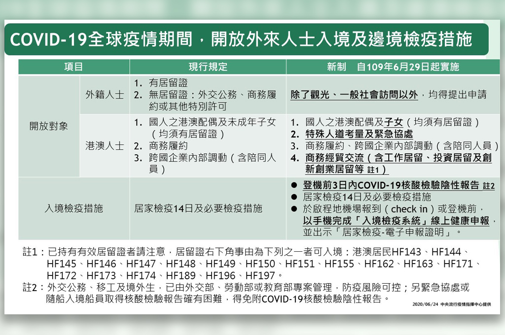 指揮中心說明,考量COVID-19國際疫情趨勢、因應商務經貿交流及人道因素等需求,自6月29日起,放寬外籍、香港及澳門人士入境對象如下: