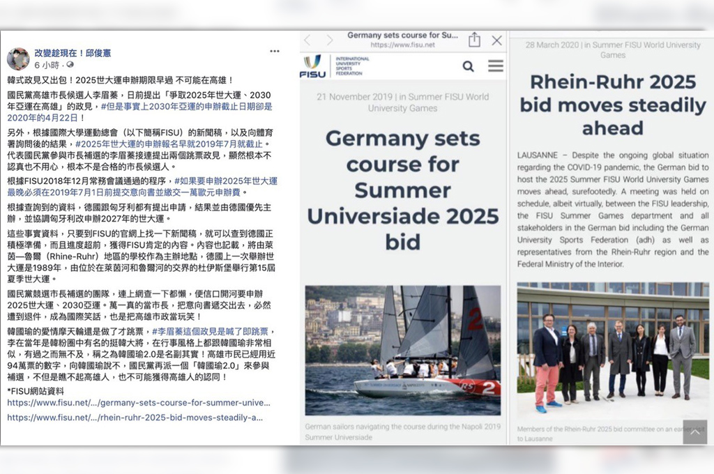 國民黨高雄市長候選人李眉蓁日前提出「爭取2025年世大運、2030年亞運在高雄」的政見,先被指正2030年亞運的申辦截止日是2020年的4月22日,沒想到李眉蓁才剛開直播道歉,立委王定宇與高雄市議員邱俊憲今(30)日再踢爆,2025年世大運申辦期限早在2019年7月就過期。李眉蓁競選政見才剛喊出,還沒上任就接連「跳票」,王定宇怒批「草包作為」根本是「小韓國瑜」。