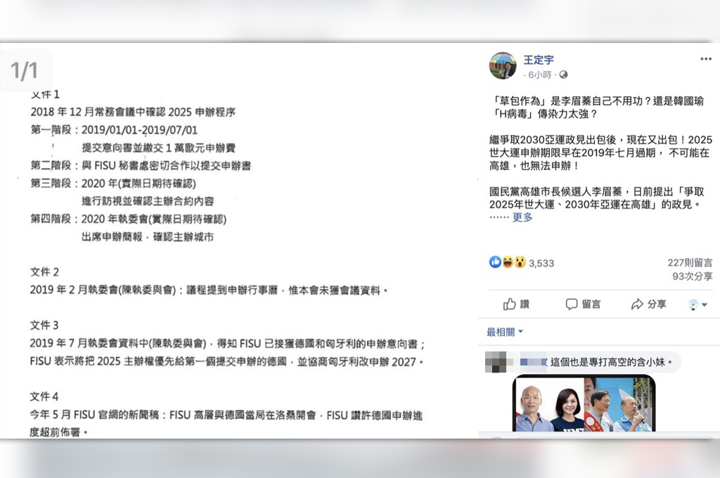 王定宇今日在臉書發文並附上資料指出,根據國際大學運動總會(FISU)的新聞稿,以及向體育署詢問後的結果,2025年世大運的申辦報名,早在2019年7月就截止;FISU 2018年12月常務會議通過的程序,如果要申辦2025年世大運,最晚必須在2019年7月1日前,提交意向書並繳交1萬歐元申辦費。