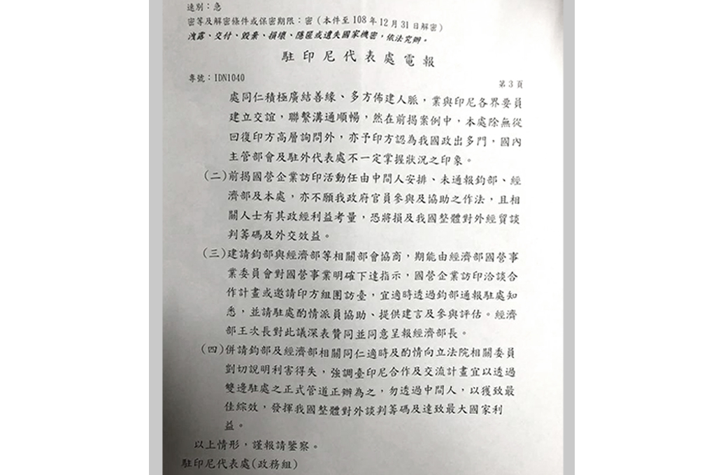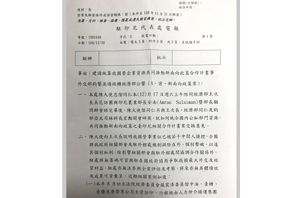 中國國民黨文傳會主委王育敏、革實院長羅智強及副院長游淑慧今(20)日召開記者會,公布外交部解密文件指稱「我國駐印尼代表處2017年回報外交部指陳,我國營事業已遭中間人控制,企圖將政府部會及駐外館處排除在外以謀取個別私利」,且總統府秘書長蘇嘉全、民進黨立委蘇震清叔姪可能涉及其中。