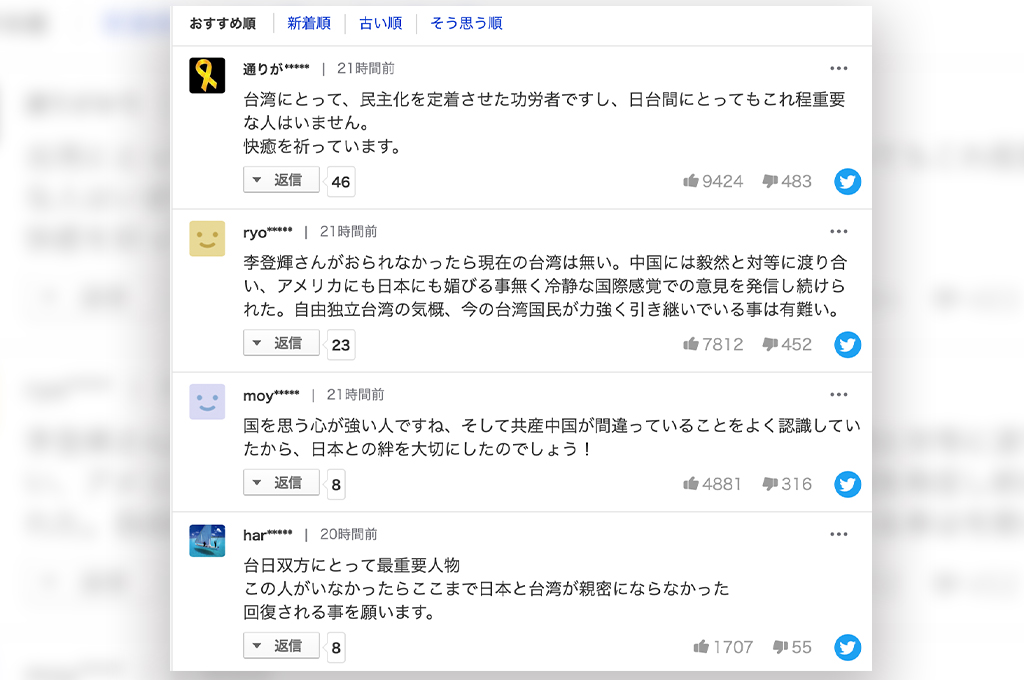 此外,李登輝最新病況的消息也登上日本Yahoo國際頭版,吸引眾多日本網友留言打氣,祈禱他能早日康復;有網友指出,李登輝為台灣民主化做出巨大的貢獻,沒有李登輝就沒有現在的台灣,也有人稱他為「台日關係最重要的人物」。
