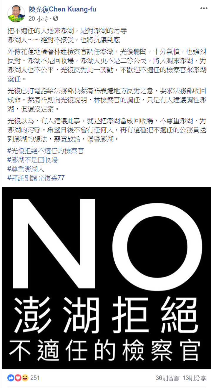 瀏覽澎湖縣長陳光復的臉書,除可看到縣政進展:醫療後送直升機於1日正式駐地澎湖,爭取急重症救護黃金治療時間;為環保的汙水下水道系統以及雨污水分流系統建設,也可看到陳光復對各項社會議題的關心(挺台中支持青年運動會),不過最新一則發文很特別,除了加粗的黑底白字「No澎湖拒絕不適任的檢察官」非常顯眼外,內文中陳光復亦提到他「非常氣憤」。
