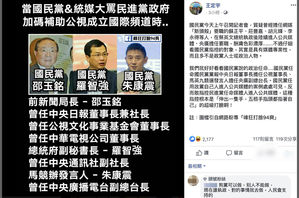 王定宇指出,國民黨執政時曾任命國民黨黨報中央日報董事長邵玉銘擔任公視董事長、馬英九競選發言人朱康震擔任央廣副總台長;他說:「國民黨任用政黨自己人進入公共媒體的案例處處可見,反而指控民進黨任命媒體人進入公共媒體,這種指控根本是『伸出一隻手,五根手指頭都指著自己』的超級打臉啊。」