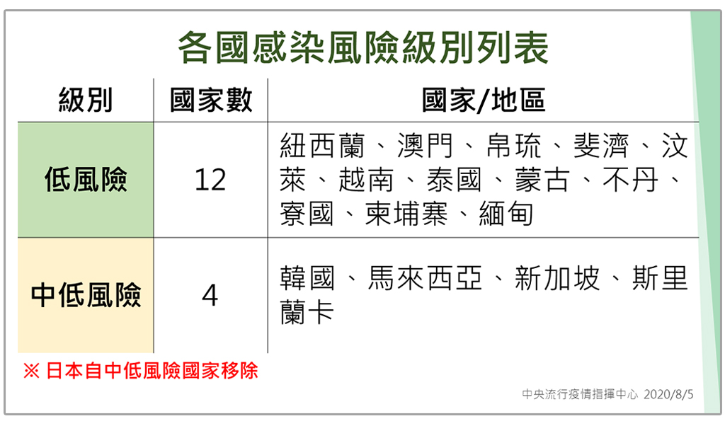 1.低感染風險國家/地區:紐西蘭、澳門、帛琉、斐濟、汶萊、越南、泰國、蒙古、不丹、寮國、柬埔寨、緬甸。