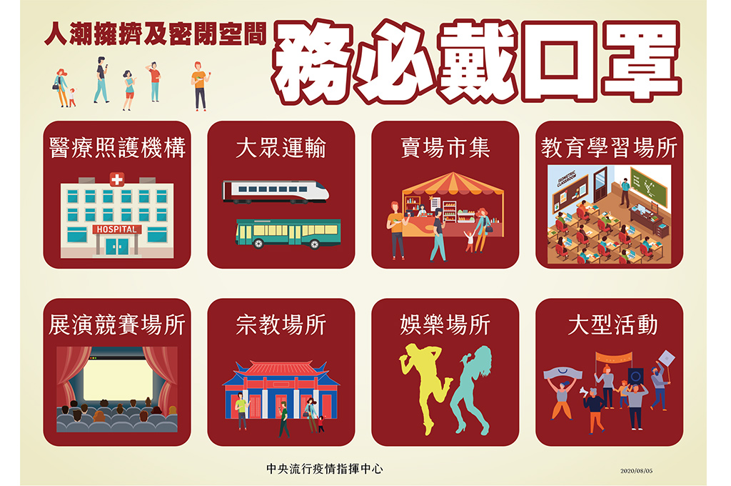 陳時中呼籲,民眾出入人潮擁擠或密閉場所,如醫療院所、人口密集機構、大眾運輸場站或無法保持社交距離之車廂、賣場或市集(百貨公司、量販店、傳統市場、夜市等)、教育學習場所(補習班、K書中心等)、休閒娛樂場所(電影院、音樂廳、體育館、兒童遊樂場、酒店、舞廳、夜店、酒吧、KTV、遊藝場等)、宗教場所及活動(廟宇、教會、禮拜、遶境等)時,請佩戴口罩,並養成勤洗手、咳嗽禮節等衛生習慣,以降低感染風險。