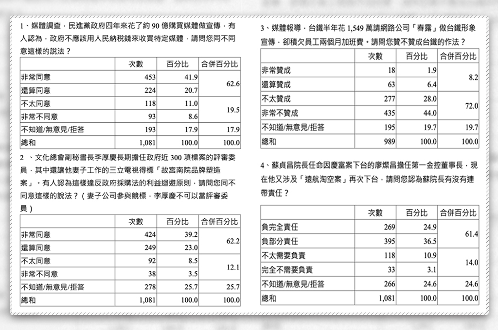 國民黨公布的民調顯示,針對先前文化總會副秘書長李厚慶遭踢爆擔任其妻工作的三立電視得標之「故宮南院品牌塑造案」標案評委一事,有六成二民眾認為此舉違反政府採購法的利益迴避原則;前第一金控董事長廖燦昌因涉入遠航超貸案而下台,有六成民眾認為任用廖燦昌擔任第一金控董座的蘇貞昌應負起連帶責任。