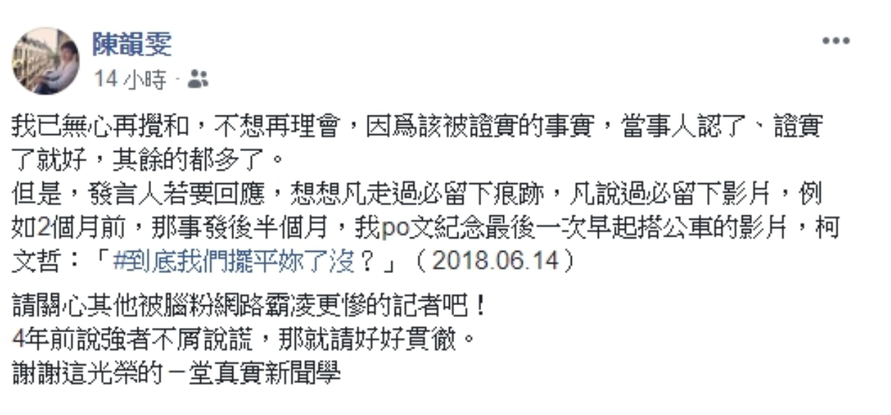 陳韻雯記者4日在《放言》報導刊出後,於臉書、Instagram上喊話,表明事發已過2個月,也離開原先的工作崗位,無心再攪和,「因爲該被證實的事實,當事人認了、證實了就好」。