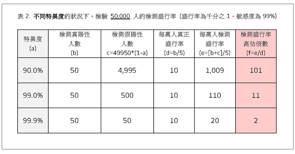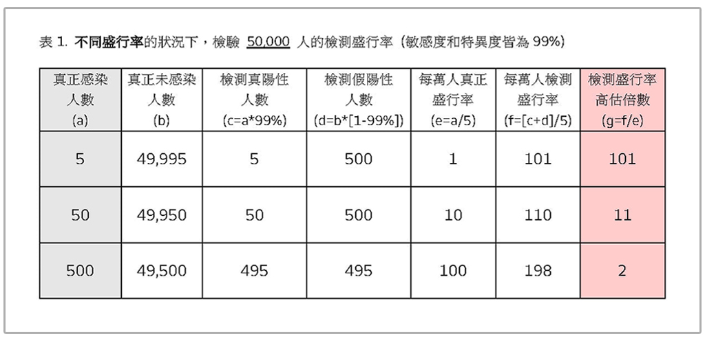 「我們舉例檢測五萬人的調查來看,如圖表1所示,如果敏感度和特異度都是99%,在每萬人盛行率分別是1,10,100的三種狀況下,真正感染人數分別是5,50,500人;真正未感染人數分別是49995,49950,49500人。由於敏感度是99%,所以在三種狀況下,真正感染檢測呈陽性人數分別是5,50,495人。由於特異度是99%,也就是真正未感染的人會有1%呈假陽性,所以在三種狀況下,假陽性人數分別是500,500,495人。因此,利用陽性人數(無法分辨真假)來估計三種狀況下每萬人檢測盛行率,分別是 101,110,198。也就是說,檢測盛行率高估倍數(g欄)竟高達到101倍,11倍,2倍。換句話說,盛行率越低,錯誤高估盛行率的失真現象越嚴重!」