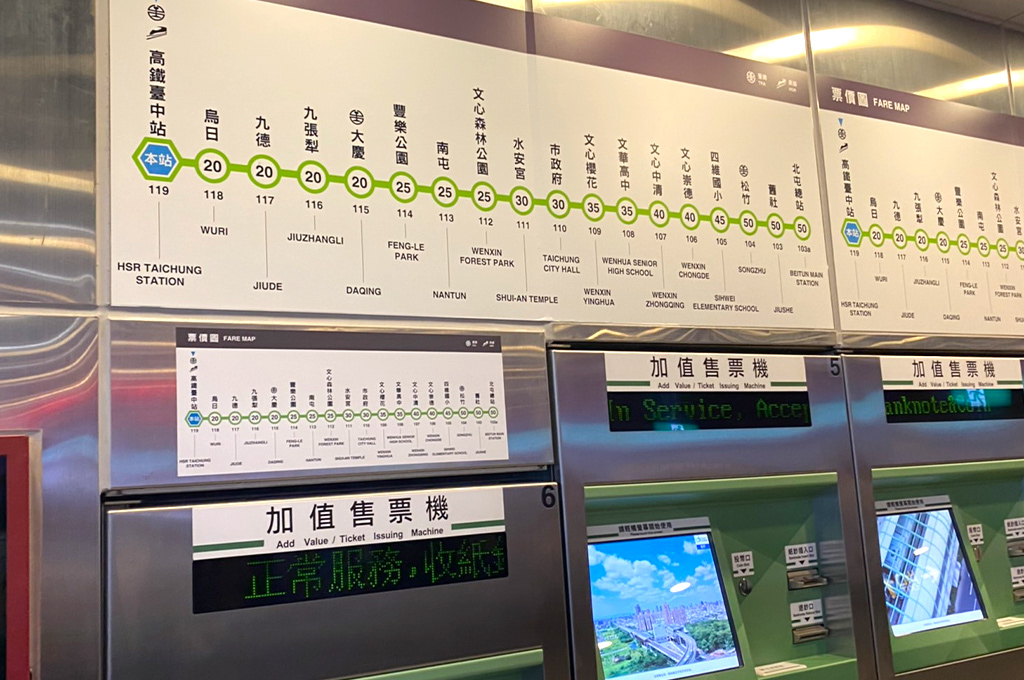 實際走進台中捷運高鐵台中站,進站後分為兩個月台,整體設施概念與台北捷運大致雷同,以綠線代表色綠色做為主基調,月台寬敞明亮並附有多台加值售票機,售票機上方與北捷相同,皆顯示中英文站名、站台編號與各站乘車價格,方便市民快速閱覽乘車資訊,另外進站口旁也有設置人員服務區,即時替民眾提供協助。