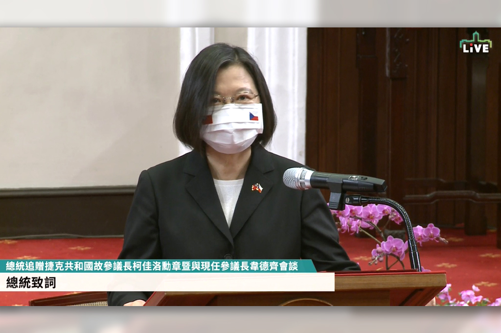 蔡英文表示,台灣和捷克一樣走過反抗威權,爭取民主自由的艱辛道路,我們以民主經驗為榮,也堅持守護民主的防線,致力於區域和平穩定和發展。