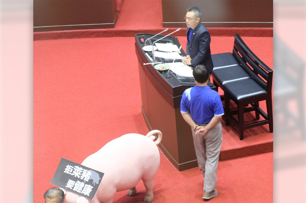 行政院長蘇貞昌今(18)日赴立法院針對美牛美豬進口議題進行專案報告並備質詢,國民黨一早開議就展開各種攻勢表達「反美豬」訴求,不只高舉粉紅豬及「反萊豬」等標語進場,還在場內高喊「蔡英文來報告」!壓軸登場質詢的國民黨籍立委洪孟楷更是準備了「驚喜」,他質詢到一半突然請其他國民黨立委端出兩盤豬肉要請蘇貞昌吃,並問「院長你吃得出哪盤是美國豬嗎?」