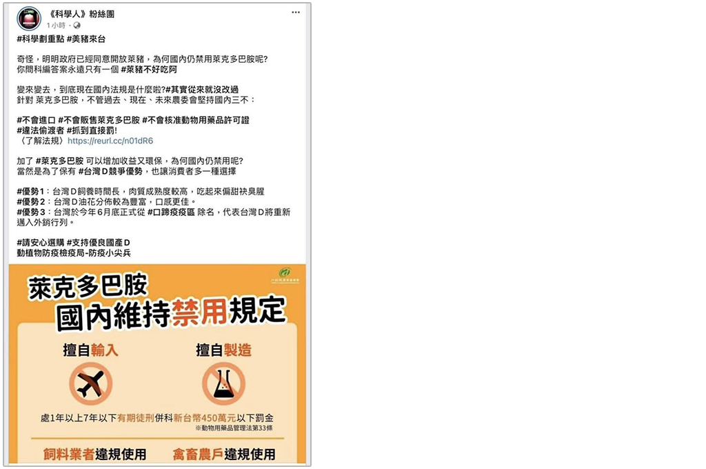《科學人》19日在臉書刊出一篇貼文指:「明明政府已經同意開放萊豬,為何國內仍禁用萊克多巴胺呢?你問科編答案永遠只有一個#萊豬不好吃啊」;內文還提及,「加了萊克多巴胺可以增加收益又環保」,引發極大爭議。