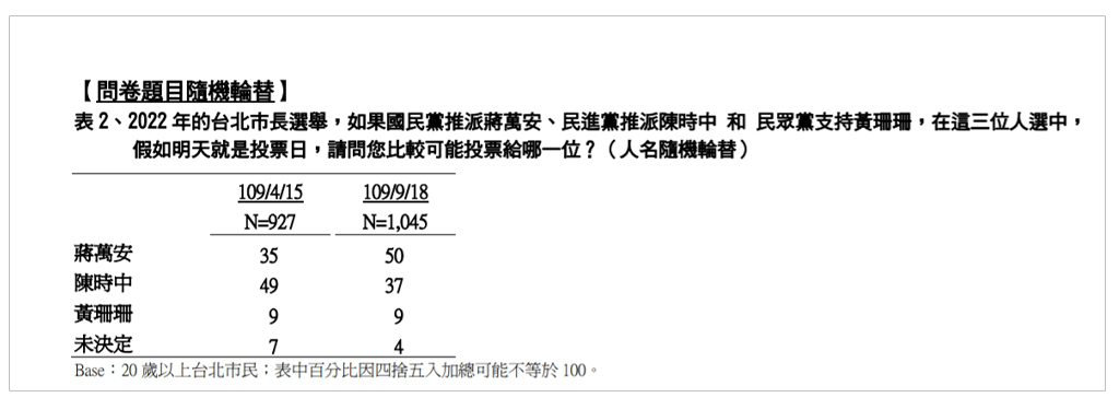 根據《TVBS》最新民調,蔣萬安獲得50%支持度,陳時中獲得37%。回顧4月時的民調顯示,陳時中當時獲得49%支持、蔣萬安是35%,明顯被逆轉。對此,陳時中在例行記者會後受訪時只說,「祝他成功」。