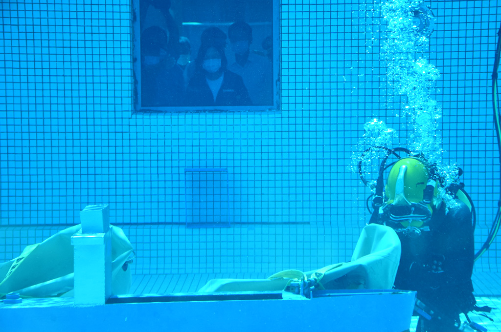 接著總統來到「海軍水下作業大隊」,視導難船浮揚實作。她致詞時指出,「我發現我今天看到的部隊都有一個共同的特點,就是無名英雄」。