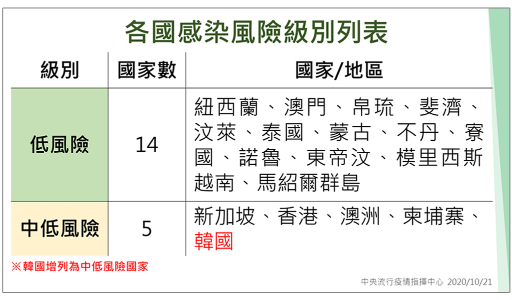 中低感染風險國家/地區:新加坡、香港、澳洲、柬埔寨、韓國。