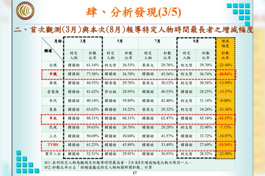 中天在去年報導韓國瑜的比例有多高呢?NCC在去年11月6日有公布一份簡報,其中整理了各新聞台在2019年3、5、7、8月報導特定人物的秒數。