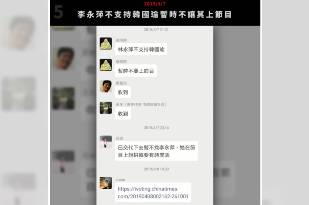 從下圖(取自黃國昌臉書)的群組對話來看,去年4月7日蔡衍明(蔡明剛)下令,因為李永萍不支持韓國瑜,暫時被指示冷凍。中天董事長廖麗生、中國時報社長王丰表示「收到」,旺中媒體集團電子媒體副總裁兼中視董事長邱佳瑜在兩小時內就完成交付任務,效率更是驚人。