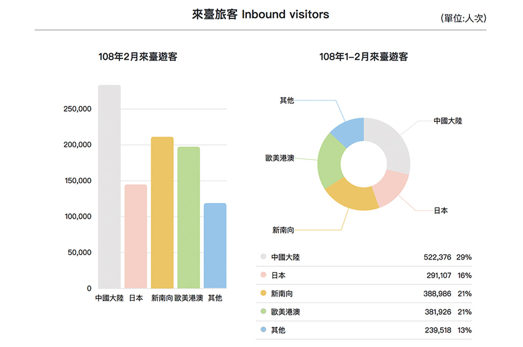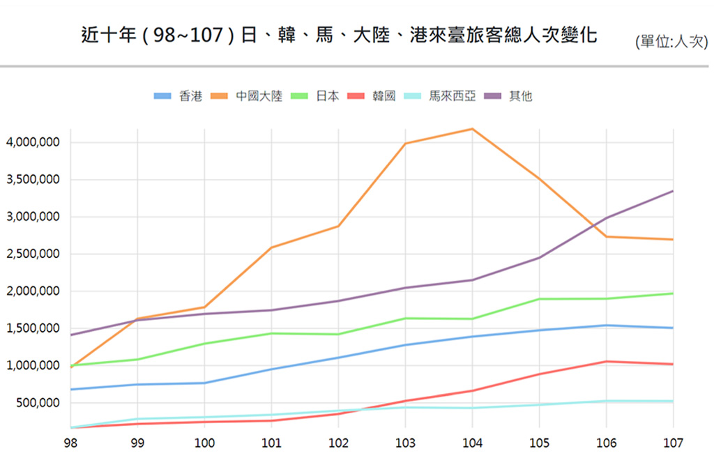 根據交通部觀光局統計近十年來台旅客總人次變化,以105年為例,中國大陸3,511,734、香港1,474,521、其他2,449,505、韓國884,397、日本1895703、馬來西亞474420;以107年為例,中國大陸2,695,615、香港1,506,536、其他3,349,835、韓國1,019,441、日本1,969,151、馬來西亞526,129,的確旅客來源趨勢正呈現微妙的轉變。