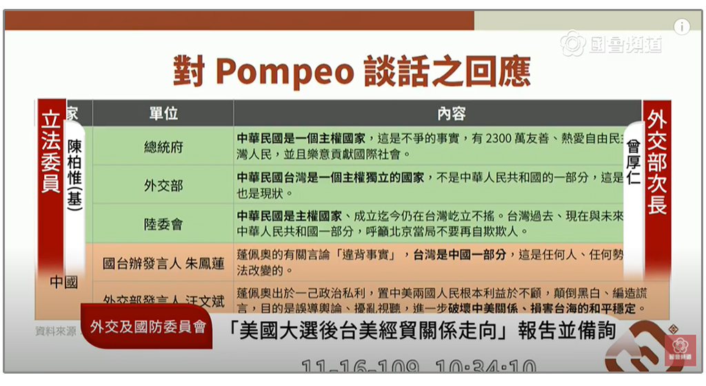 對於龐佩歐的說法,政府不同部門的回應各自不同。陳柏惟指出,「總統府說:中華民國是一個主權國家;外交部說:中華民國台灣是一個主權獨立的國家;陸委會說:中華民國是主權國家」,他質疑「政府真的要這麼模糊嗎?能不能立場堅定一點?用中華民國是好意,但中國真的有辦法接受嗎?」