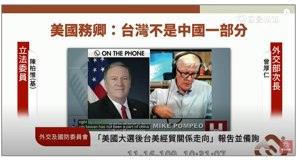美國務卿近日言明「台灣不是中國的一部分」,外交部次長曾厚仁今日備詢時回應,這句話是對於事實的描述,很高興美國務卿做這樣的陳述。龐佩歐這段談話還有提到,這是從美國總統雷根時代就開始的,六項保證裡面提到,對於台灣主權地位並不改變,這是美國跨黨派-民主黨跟共和黨的共識。