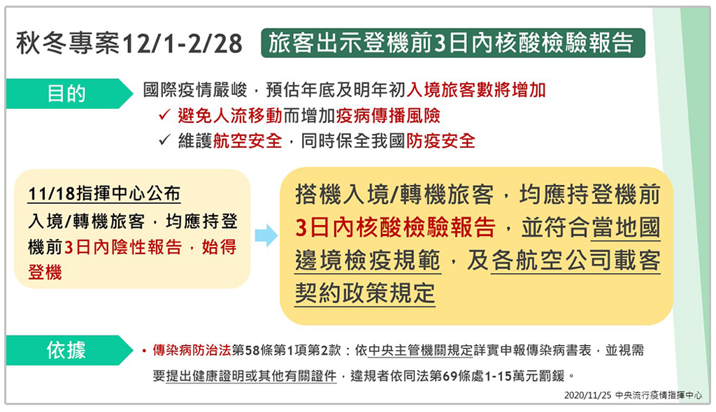 中央流行疫情指揮中心今(25)日再宣布秋冬專案入境配套措施。國際COVID-19疫情嚴峻,加上聖誕節、寒假、春節將至,預期返臺旅客數增加。為確保同班機旅客、機組員及國內社區的防疫安全,自今年12月1日起實施秋冬防疫專案,請來臺旅客登機前配合出示3日內COVID-19核酸檢驗報告。副指揮官陳宗彥說明,超過九成以上國家都可自費採檢,若有臨時緊急狀況也會提供協處,像是先登機,返國後在機場做自費採檢。