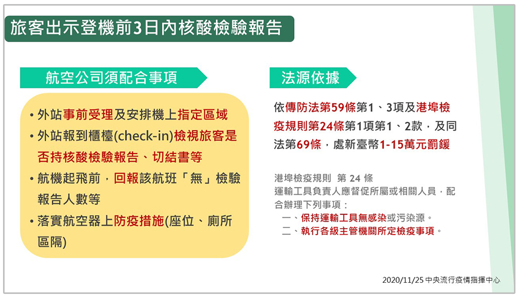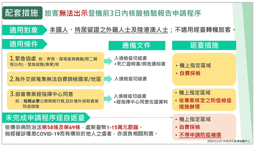 若旅客登機前無法出示3日內COVID-19核酸檢驗報告,但符合以下三種情形,指揮中心宣布,不予裁罰。(適用對象包括本國人、持居留證之外籍人士及持居留證之陸港澳人士;不適用經臺轉機旅客。)