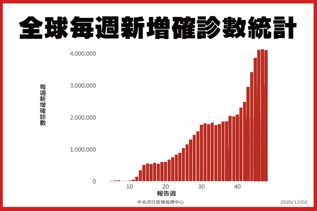 國際疫情方面,指揮中心監測資料顯示,全球累計63,876,680例確診,分布於191個國家/地區;病例數以美國13,900,231例、印度9,462,809例、巴西6,386,787例、俄羅斯2,322,056例及法國2,230,571例為多;病例中1,482,628例死亡,以美國275,051例、巴西173,817例、印度137,658例、墨西哥105,940例及英國59,051例為多。