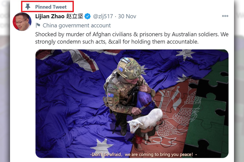趙立堅11月30日在個人推特上貼出的圖片,引起澳洲人不滿。起因為澳洲特種部隊前幾年曾在在阿富汗殘忍殺害當地手無寸鐵的平民、囚犯等,外媒報導,澳洲政府也證實有19人涉嫌在阿富汗濫殺39人。趙立堅對此發「圖片」,表達譴責。