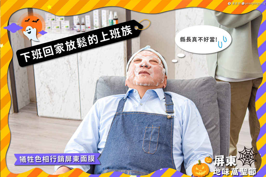 社群小編的操作總令人印象深刻。比如10月中在臉書掀起一波「南部肉燥飯」之戰,潘孟安驕傲地說「不用去爭,我們就已經一口入魂了!」還有9月份的「第一屆吉卜力城市迷因大賽」,小編早就收集了屏東各地的特色,便趕快在第一時間發文,搶搭熱潮推銷屏東觀光。不計較在「地味萬聖節」梗圖中毫無形象的敷著面膜,潘孟安反倒自豪「屏東是全台最大的面膜生產基地,還有龍膽石斑魚跟洋蔥風味的面膜」。
