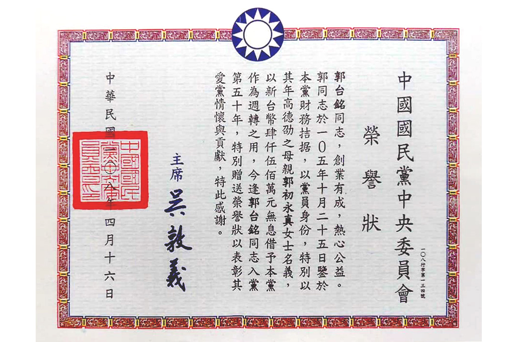 吳敦義今日下午3點在中山廳舉行「中國國民黨中央委員會榮譽狀受贈儀式」,親授郭台銘榮譽狀,該榮譽狀內容表示,「郭台銘『同志』,創業有成,熱心公益。郭同志於105年10月25日鑒於本黨財務拮据,以『黨員』身份,特別以其年高德劭之母親郭初永真女士名義,以新台幣4500萬元無息借予本黨作為週轉之用,今逢郭台銘同志入黨第50年,特別贈送榮譽狀以表彰其愛黨情懷與貢獻,特此感謝。」