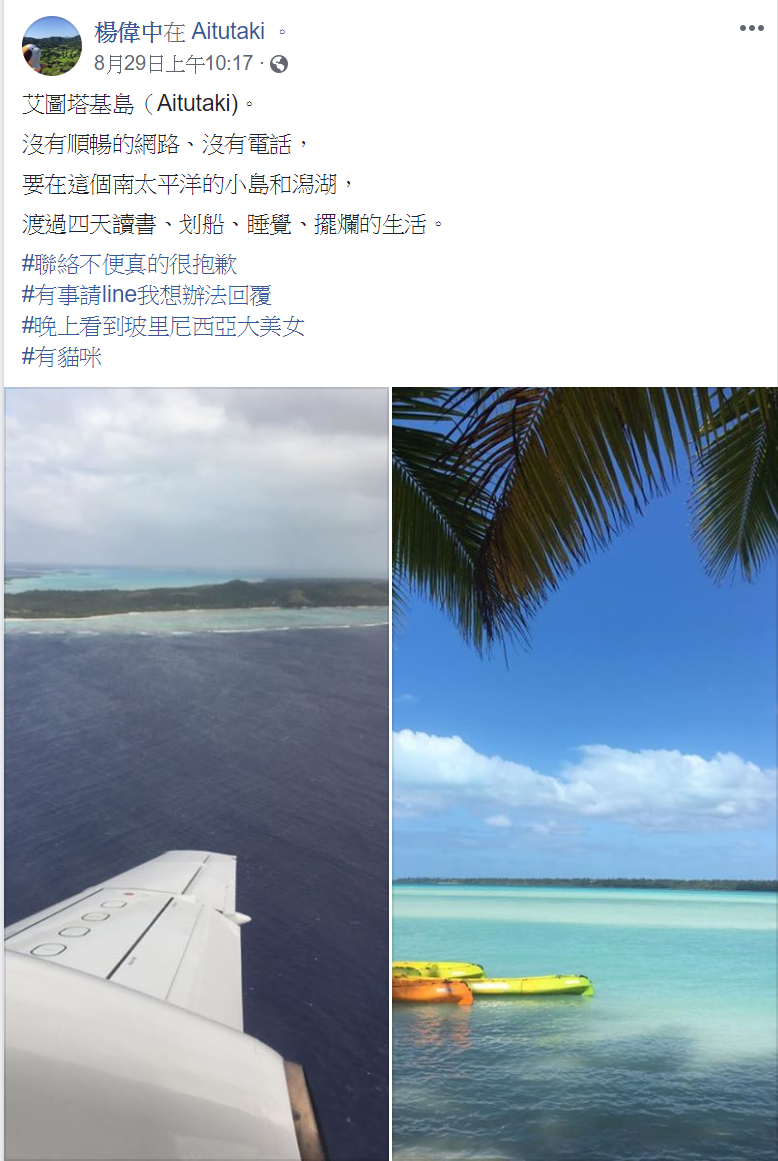 楊偉中於文字領域的最後一篇遺作,上頭除看出他度假的好心情,也看出他忙裡偷閒的心境,實則對於台灣的事情還是有些掛念(#聯絡不便真的很抱歉#有事請line我想辦法回覆),因此許多網友的留言與回應,也格外令人唏噓:「感謝您為臺灣付出的一切感謝你對這片土地的貢獻 ...................」