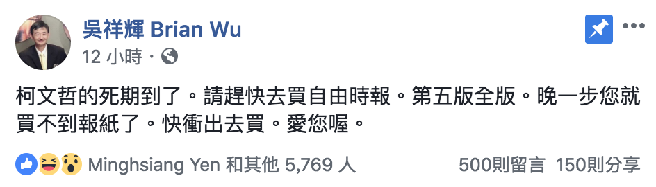 「蝴蝶蘭文創」昨在報上刊登《屠殺》一書全版廣告,並摘錄影射柯文哲帶病人赴中國大陸進行器官移植的內容,吳祥輝更於今日上午在臉書指出「柯的死期到了」並呼籲民眾儘快購買報紙,強調「晚一步您就買不到報紙了。」針對吳此舉,王威中也於臉書痛批「請問發文者的腦還活著嗎,還是已經被摘除了?」也表示「難道已經不會堂堂正正對決了嗎?丟這種早已被原作者澄清過的假新聞出來,打擊對手形象,有用嗎?」直言「一早便看到此消息在line上面各群組不斷瘋傳,只覺得太噁心了」,王威中認為吳作此發言,雖然能贏回一點民進黨基本盤,但中間選民將跑掉更多,強調此舉犧牲的是民進黨的形象。