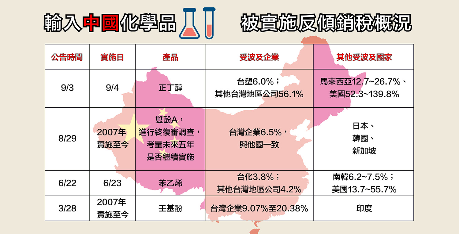 而隨著2013年一波石化品被控反傾銷稅後,2018年陸續又被重啟調查,根據中華人民共和國商務部今年資料顯示,受諸多中國國營化工公司聯合具名要求,請中國商務部展延部分國家對中國輸入之化學品雙酚A及壬基酚的反傾銷稅。其中,受調查對象除美國、南韓、日本及印度等獨立國家之外,還包含了台灣地區。