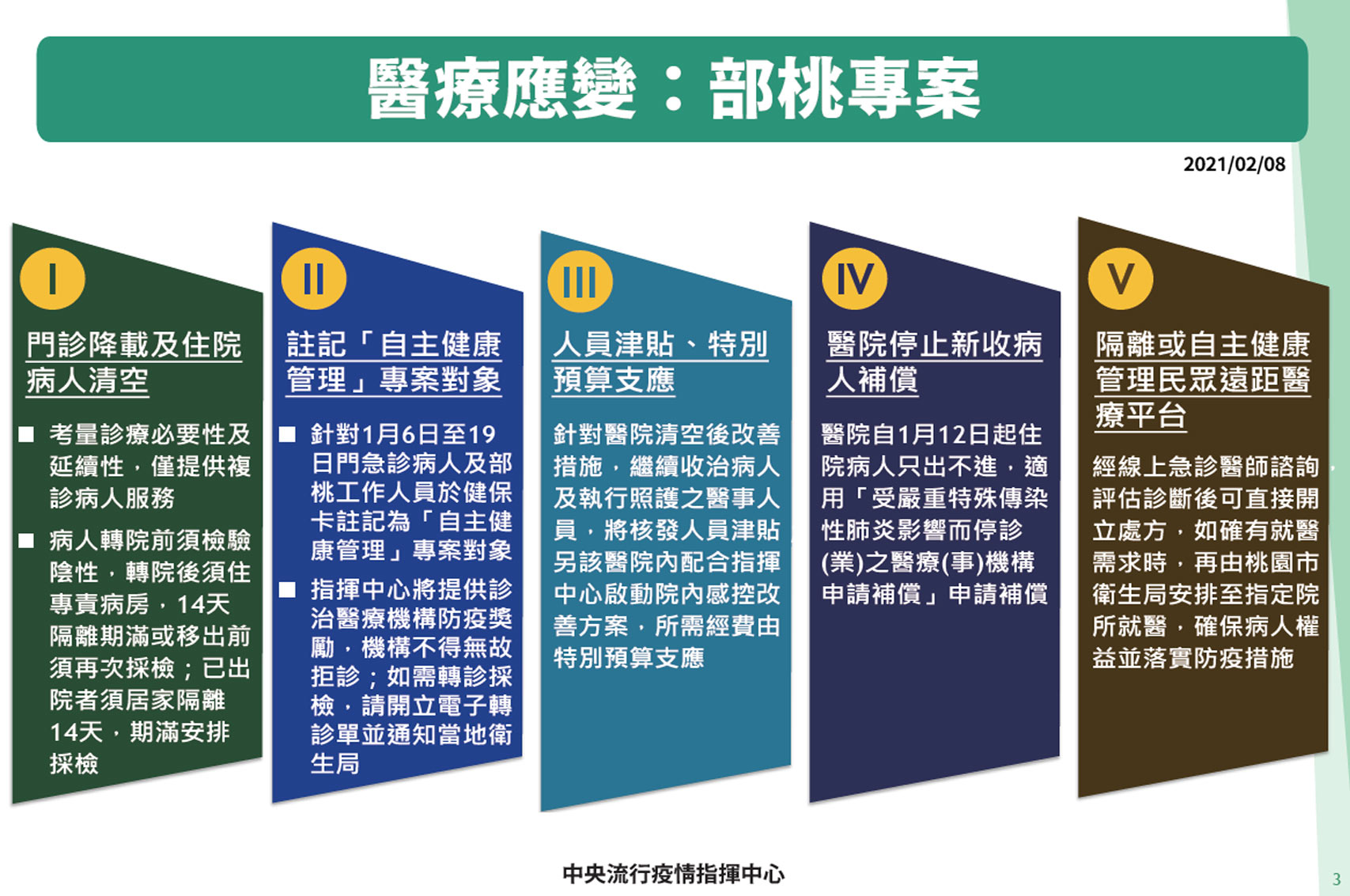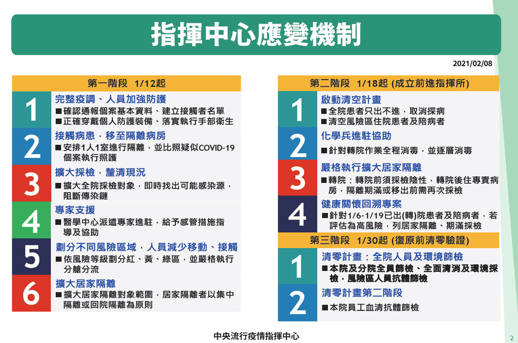 因應部桃事件,羅一鈞表示,指揮中心採取的應變機制包括,完整疫調、擴大採檢及居家隔離對象、落實接觸病患一人一室隔離;再到成立前進指揮所、啟動清空計畫、化學兵進駐協助,並嚴格執行擴大居家隔離、也啟動健康關懷回溯專案。