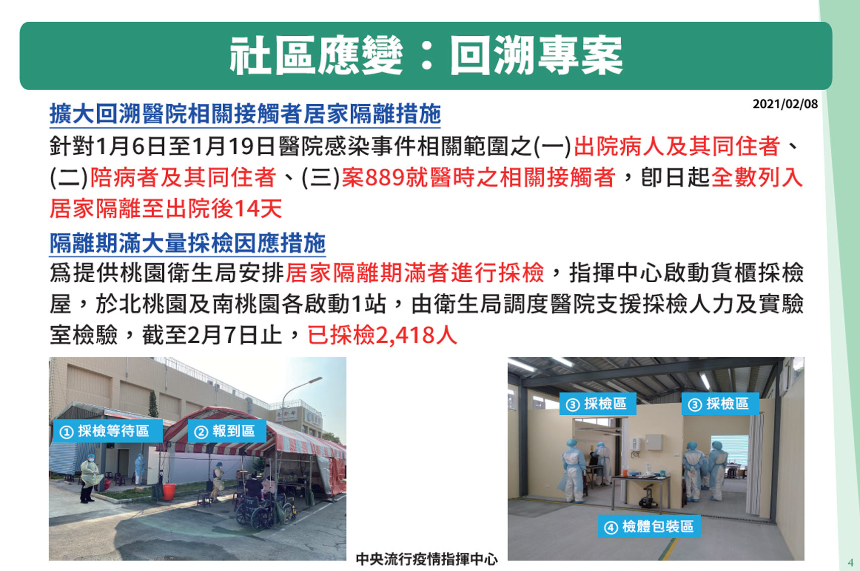 針對社區應變也啟動回溯專案,羅一鈞表示,總共擴大匡了4000多人,居家隔離期滿仍必須進行採檢,並首度啟用貨櫃採檢站,讓民眾有安心、隱私空間採檢,截至2月7日止,已採檢2418人。