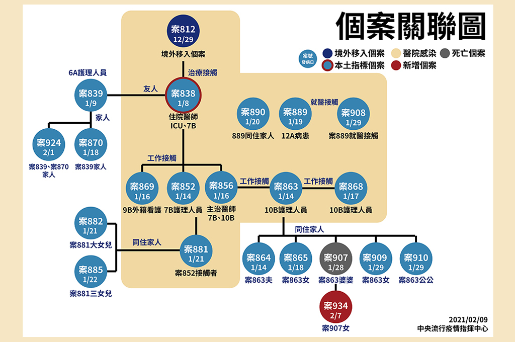 指揮中心表示,案934為本國籍50多歲女性,因匡列為案864、907、909及910之接觸者,自1月19日起進行居家隔離,隔離期間曾接受5次採檢,結果皆為陰性;個案2月7日曾出現發燒、鼻涕倒流情形,2月8日自覺已無症狀,因申請外出奔喪,由衛生單位安排至醫院採檢,於今日確診。