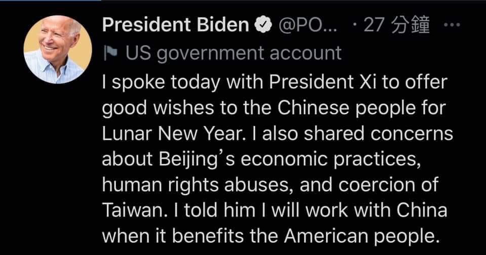 拜登在推特表示,今天他與習近平通話,向習道賀華人的農曆春節。拜登也表達對於美中經貿、中共侵犯人權、施壓台灣等議題的關切。拜登告訴習近平,當某項議題有利於美國民眾的福祉,他將與中國進行合作。