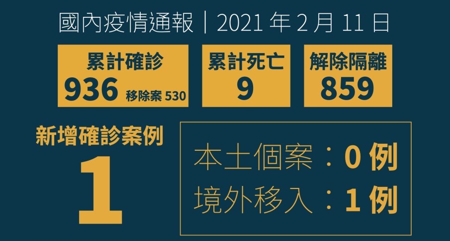 據指揮中心統計,截至目前國內累計167,004例新型冠狀病毒肺炎相關通報(含163,987例排除),其中936例確診,分別為820例境外移入,77例本土病例,36例敦睦艦隊、2例航空器感染及1例不明;另1例(案530)移除為空號。確診個案中9人死亡、859人解除隔離、68人住院隔離中。
