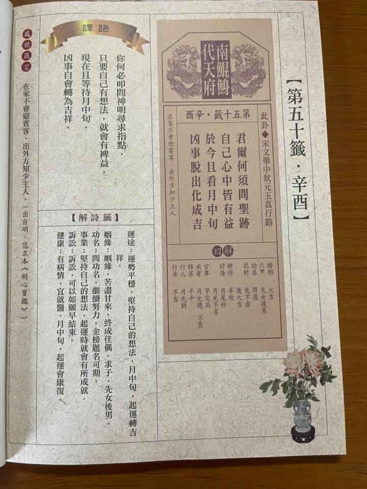 在廟方的籤詩解密中記載該籤詩的譯語是:「你何必叩問神明尋求指點,只要自己有想法,就會有裨益。現在且等待月中旬, 凶事自會轉為吉祥。」