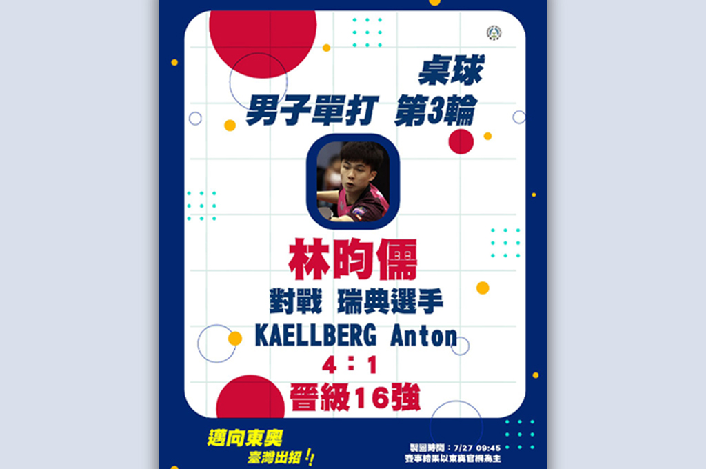林昀儒稍早在與瑞典好手卡爾伯格的比賽中,以4比1好表現旗開得勝,順利闖進16強,預計下一場將對上奈及利亞選手利亞阿魯納、巴西選手坪井的勝者。