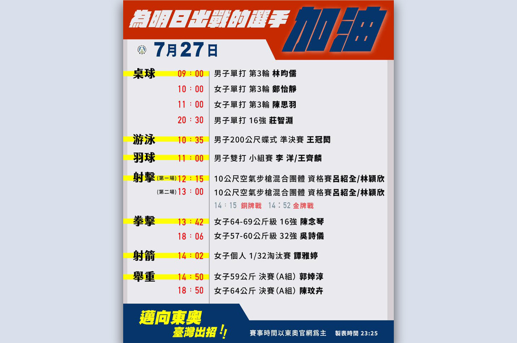 東京奧運開幕第三日,中華健兒們繼續展現訓練成果,努力為台爭光,拚取亮眼好成績。《放言》今(27)日再度為讀者帶來今出賽選手賽程、項目;其中,「桌球教父」莊智淵晚間8點30分將迎來男單16強比賽,為今所有選手中最晚出賽選手,而「舉重女神」郭婞淳則將在下午2時50分參加女子59公斤級決賽,被外界視為有望替台力拼本屆奧運第一金有力人選。