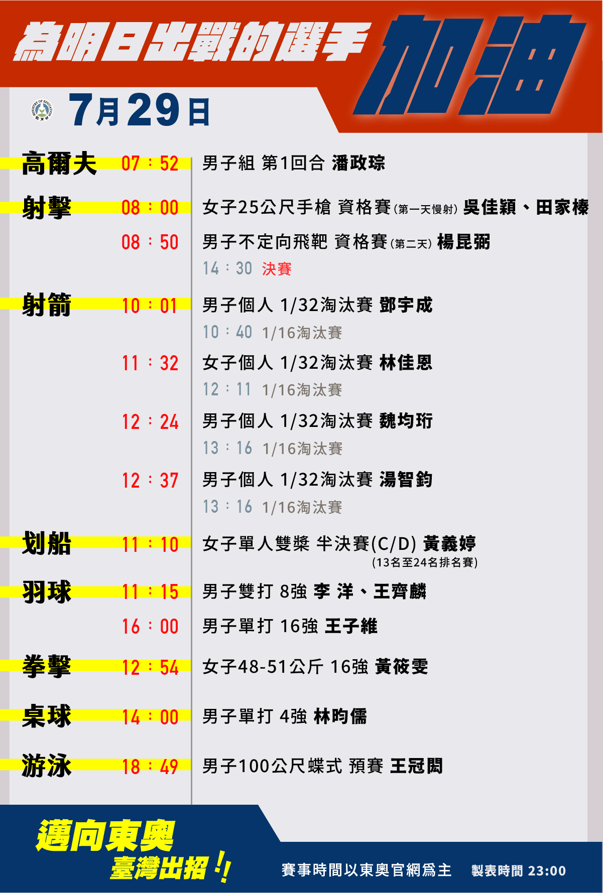 東京奧運進入第七天,我國代表隊選手已為台灣贏得六項獎牌,成功打破台灣過去在奧運拿牌的紀錄。不僅如此,仍有許多熱門奪牌選手尚未結束他們的賽事。至於今日(29日)有機會再為台灣奪下一面獎牌的選手有桌球男單的林昀儒,以及男子射擊不定向飛靶的楊昆弼。