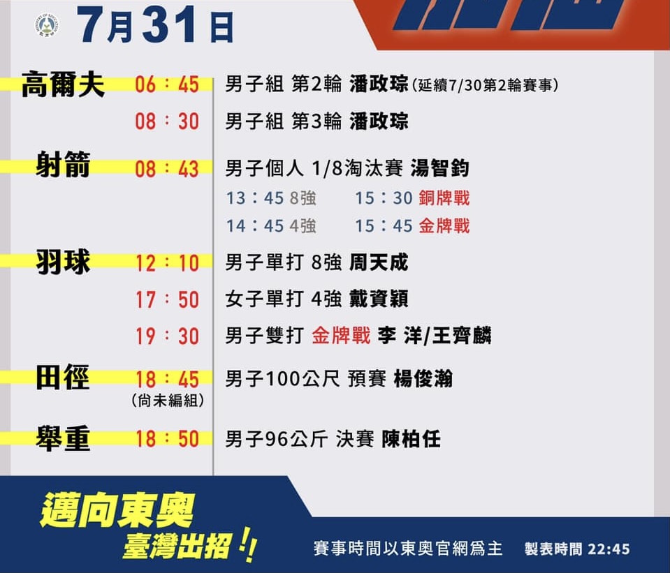 東京奧運進入第九天,我國代表隊選手已為台灣贏得六項獎牌。王齊麟與李洋昨日在4強中獲勝,成為台灣羽球史上首度闖進奧運決賽的球員,今(31)日晚間將與中國組合爭奪金牌,有望再為台灣奪下第二面金牌;世界球后戴資穎昨日歷經3局苦戰拿下勝利,今晚將迎戰印度名將辛度(Pusarla V. Sindhu),尋求本屆第2張羽球決賽門票。